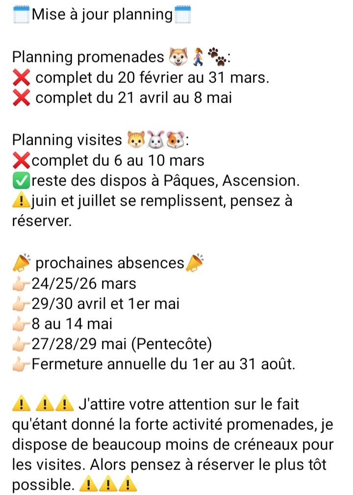 Parfait, Noemie est très professionnelle et s’occupe très bien de nos animaux. Je recommande a 100%